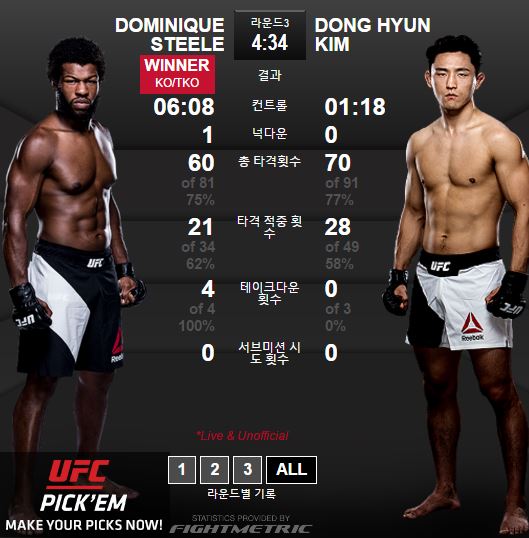 [아시아경제 온라인이슈팀]도미니크 스틸(미국)의 압도적인 승리였다. 초반 난타전을 무색하게 만드는 경기였다.28일 서울 올림픽체조경기장에서는 'UFC Fight Night 79' 언더카드 웰터급 매치가 진행됐다. 이날 경기에서 스틸은 김동현을 상대로 3라운드 26초 만에 KO승을 거뒀다.1라운드는 양 선수가 팽팽히 맞섰다. 서로 엘보우를 안면에 꽂아 넣었고 점수를 주고 받았다.그러나 2라운드는 스틸의 압승이었다. 초반 김동현은 니킥으로 분위기를 뒤집으려 했으나, 스틸의 라이트가 더 강했다. 스틸의 라이트는 김동현의 안면을 정확히 가격했고, 김동현은 중심을 잃고 쓰러졌다. 이후 2라운드 종료까지 스틸이 상위 포지션을 가져가며 수차례 엘보우로 김동현을 가격했다. 3라운드의 시작과 함께 스틸은 김동현를 옥타곤 바닥에 내리 꽂았다. 심하게 머리에 충격을 받은 김동현는 정신을 잃었고 스틸은 엘보우로 승부에 마침표를 찍었다. 경기 후 스틸은 승리 비결에 대해 "적극적인 엘보우 공격을 퍼부었다"고 말했다.한편 한동안 그라운드에서 일어나지 못한 김동현은 경기 종료 선언 약 5분 후 겨우 몸을 일으켰다.온라인이슈팀 <ⓒ세계를 보는 창 경제를 보는 눈, 아시아경제(www.asiae.co.kr) 무단전재 배포금지>