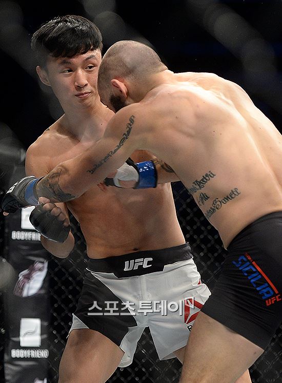 [아시아경제 온라인이슈팀]최두호(한국)가 샘 시실리아에 KO승을 거뒀다.최두호는 28일 서울 올림픽체조경기장에서 열린 UFC 파이트 나이트(UFC 서울) 페더급 샘 시실리아(미국)과 경기서 1라운드 KO 승을 챙겼다. 최두호는 지난해 시실리아를 상대로 UFC 데뷔전을 치를 예정이었지만 어깨와 발목 인대 부상으로 무산됐다. 또 지난 7월 두번째로 대결을 펼칠 예정이었지만 또한번 부상으로 대결이 이뤄지지 못했다. 이에 UFC는 다시 최두호와 시실리아를 UFC 서울에서 맞대결 상대로 정했다. 최두호는 비로써 이날 회심의 펀치를 날리며 옥타곤에 넘어 트린 뒤 소나기 펀치로 KO승을 이끌었다. 온라인이슈팀 issue@asiae.co.kr<ⓒ세계를 보는 창 경제를 보는 눈, 아시아경제(www.asiae.co.kr) 무단전재 배포금지>