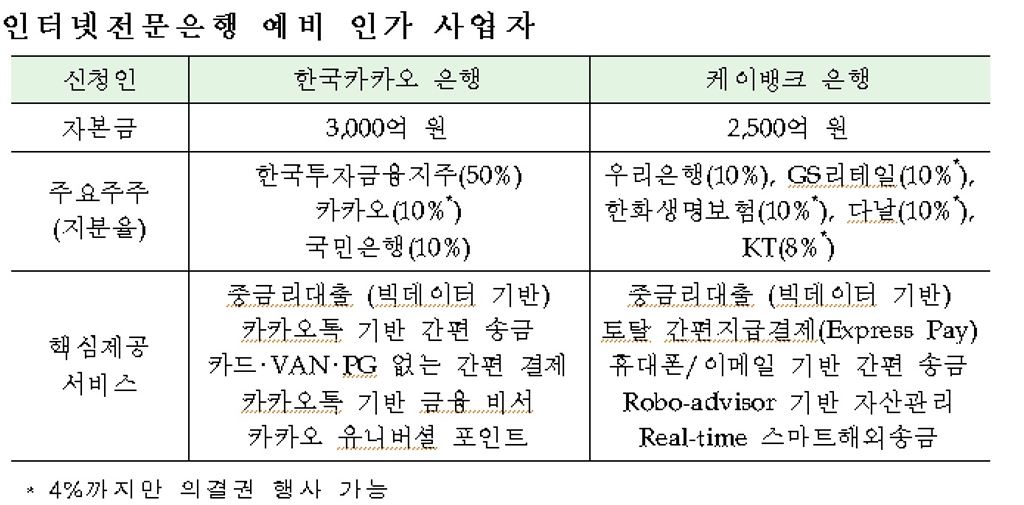 [아시아경제 이은정 기자, 강구귀 기자, 조은임 기자] 대한민국의 첫 인터넷전문은행 사업자로 카카오컨소시엄(한국카카오은행)과 KT컨소시엄(K뱅크)이 선정됐다. 지난 2개월간 이들과 함께 피말리는 경쟁을 펼쳤던 인터파크컨소시엄(I뱅크)은 최종 심사 문턱을 넘지 못해 예비인가 사업자로 선정되지 못했다. 금융위원회는 외부평가위원회의 사업계획 혁신성 등에 대한 평가의견 등을 감안해 카카오은행과 K뱅크 등 2곳에 예비인가를 내줬다고 29일 밝혔다. 금융위가 은행 예비 설립인가를 내준 것은 1992년 평화은행 이후 23년만이다. 앞서 금융위는 지난 9일 금융·법률·소비자·핀테크·회계·IT보안·리스크관리 전문가 7명으로 외부평가위원회를 구성해 사업계획 타당성 등을 검토했다. 외부평가위원회는 또 27일 부터 2박3일간 3개 신청자에 대한 서류심사와 신청자별 사업계획 청취·질의응답을 진행한 후 이날 오전 "카카오은행과 K뱅크 은행의 사업계획이 타당해 예비인가하는 것이 바람직하다"는 심사의견을 금융감독원에 제출했다.