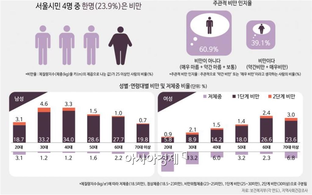 [아시아경제 원다라 기자] 서울 시민의 비만율이 매년 증가하고 있는 것으로 나타났다. 또 서울 시민 2명중 1명은 하루에 30분도 걷지 않았다. 30일 서울연구원에 따르면 지난해 기준 체질량지수가 25 이상인 서울시민은 전체의 23.9%로 지난 2008년(20.6%)이후 증가추세를 이어갔다. 체질량지수(kg/㎡)가 25이상이면 비만으로 분류되며, 18.5 미만이면 저체중, 18.5 이상 23 미만이면 정상체중, 23 이상 25 미만이면 비만위험체중으로 구분된다. 주관적 비만 인지율도 매년 증가해 지난해 서울 시민의 39.1%가 스스로 비만이라고 생각하는 것으로 나타났다.▲체중관리가 필요한 서울시민 연령대는? (서울인포그래픽스 제163호) (제공=서울연구원)