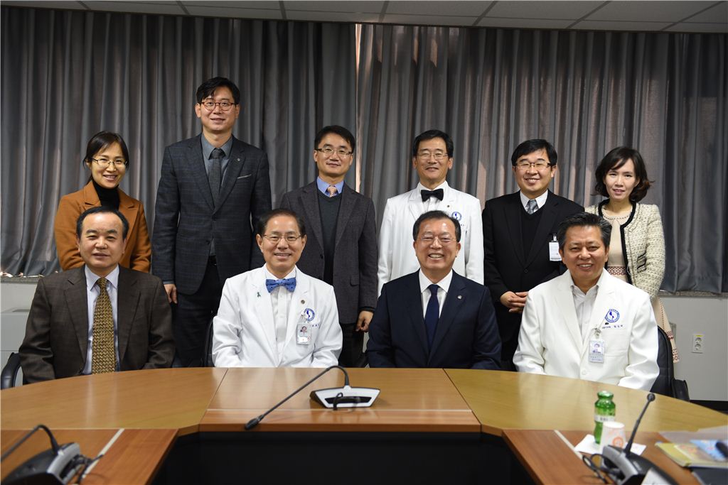 홍승표 경기관광공사 사장(앞줄 오른쪽 두번째)과 유희석 아주대의료원장(앞줄 오른쪽 세번째)이 지난달 30일 의학분야 마이스산업 활성화를 위한 협약을 체결한 뒤 기념촬영을 하고 있다.