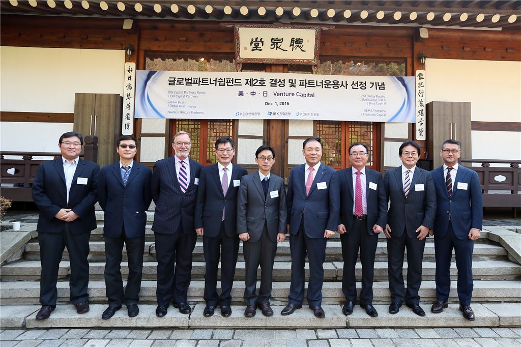 왼쪽부터 브라이언 강 미국 Nautilus Venture Partners 대표, 궈이홍 중국 IDG Capital Partners 파트너, 로버트 버치 미국 Red Badge 대표, 민경진 산업은행 부행장, 최용호 금융위원회 산업금융과장, 김영규 기업은행 부행장, 서상철 산은자산운용 대표, 야스히코 유리모토 일본 Global Brain 대표, 박성빈 미국 Translink Capital 대표. 사진제공 산업은행