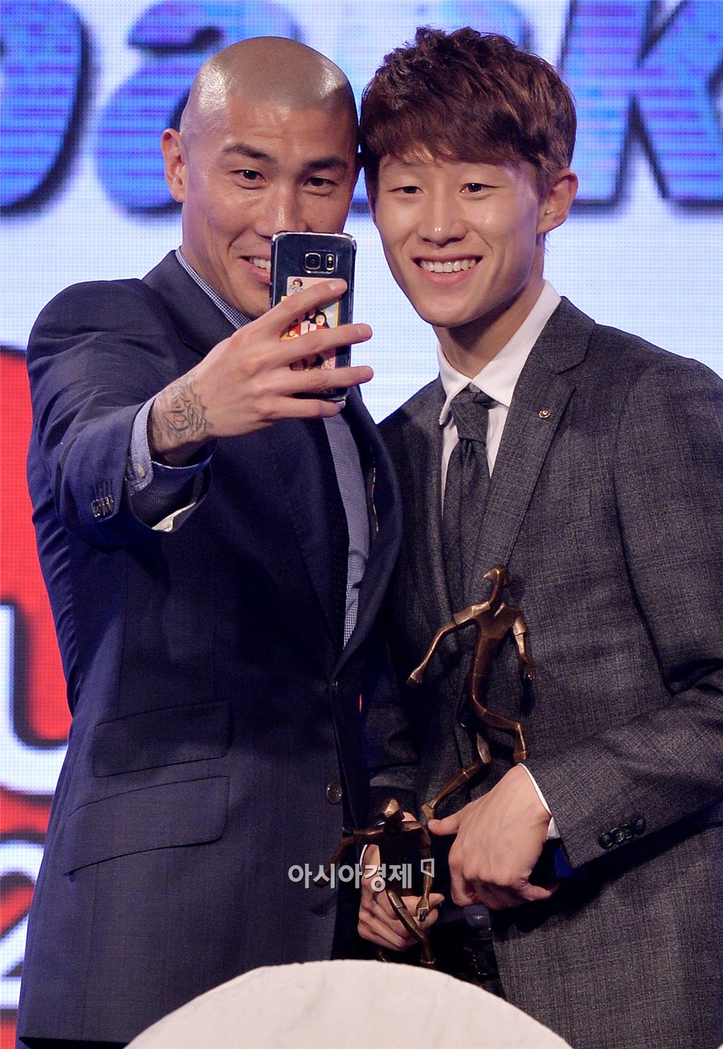 [아시아경제 김현민 기자] 2015 K리그 대상 시상식이 1일 서울 홍은동 그랜드힐튼호텔에서 열렸다. FC서울 차두리가 전북 현대 이재성과 휴대폰으로 추억을 담고 있다. 김현민 기자 kimhyun81@asiae.co.kr<ⓒ세계를 보는 창 경제를 보는 눈, 아시아경제(www.asiae.co.kr) 무단전재 배포금지>