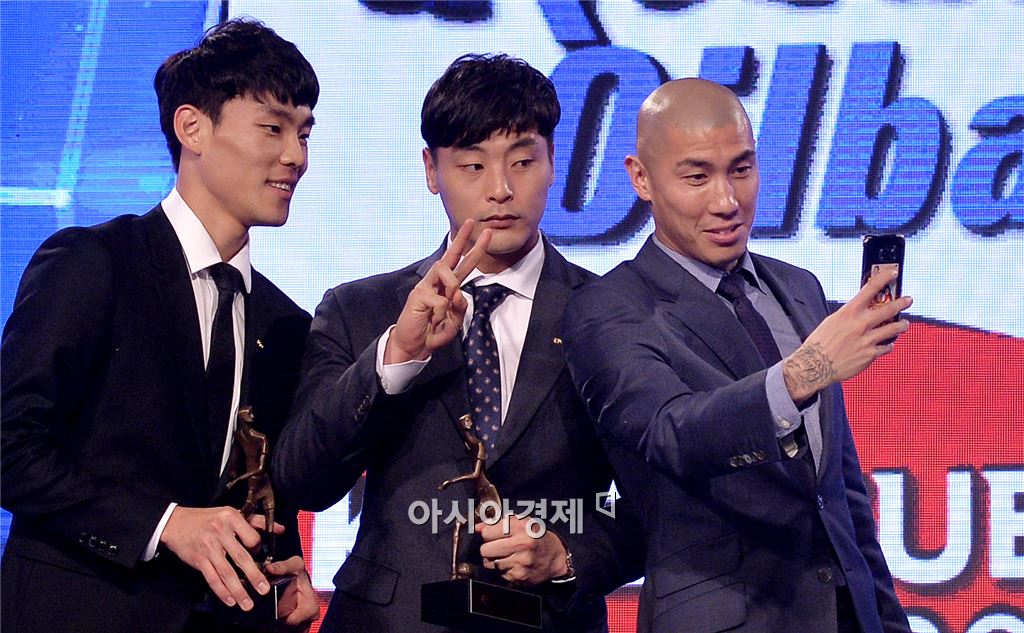 [아시아경제 김현민 기자] 2015 K리그 대상 시상식이 1일 서울 홍은동 그랜드힐튼호텔에서 열렸다. FC서울 차두리가 전북현대 권순태·김기희와 휴대폰으로 추억을 담고 있다. 김현민 기자 kimhyun81@asiae.co.kr<ⓒ세계를 보는 창 경제를 보는 눈, 아시아경제(www.asiae.co.kr) 무단전재 배포금지>