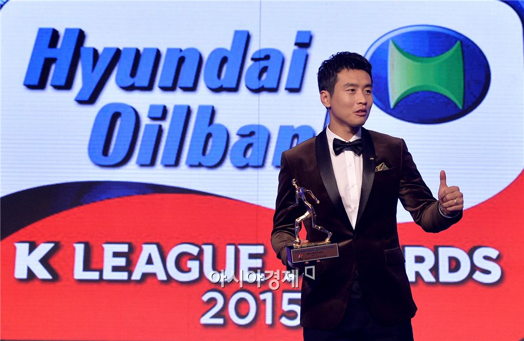 [아시아경제 김현민 기자] 2015 K리그 대상 시상식이 1일 서울 홍은동 그랜드힐튼호텔에서 열렸다. MVP를 수상한 전북현대 이동국이 엄지손가락을 세우고 있다. 김현민 기자 kimhyun81@asiae.co.kr<ⓒ세계를 보는 창 경제를 보는 눈, 아시아경제(www.asiae.co.kr) 무단전재 배포금지>