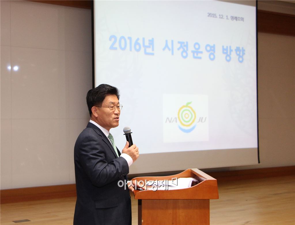강인규 시장이 1일 오전 PT로 진행한 12월 정례회에서 올 한해 추진했던 시정에 대한 평가에 이어 내년도 시정운영 방향과 역점사업을 설명하고 있다. 사진=나주시