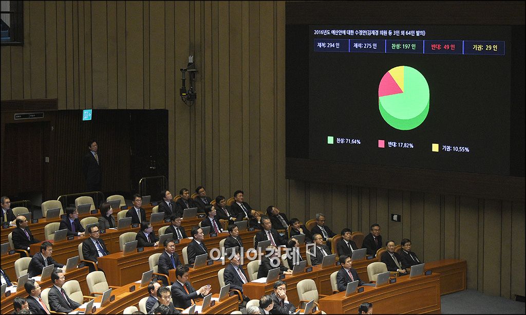 [아시아경제 윤동주 기자] 내년도 예산안 처리를 위한 마지막 날인 2일 서울 여의도 국회 본회의장에서 내년도 예산안 개정안이 본회의를 통과하고 있다. 내년도 예산안은 정부 예산(세출 기준)을 당초 정부가 제출한 386조7천억원보다 3천억원 순삭감한 386조4억원으로 확정했다.윤동주 기자 doso7@asiae.co.kr<ⓒ세계를 보는 창 경제를 보는 눈, 아시아경제(www.asiae.co.kr) 무단전재 배포금지>