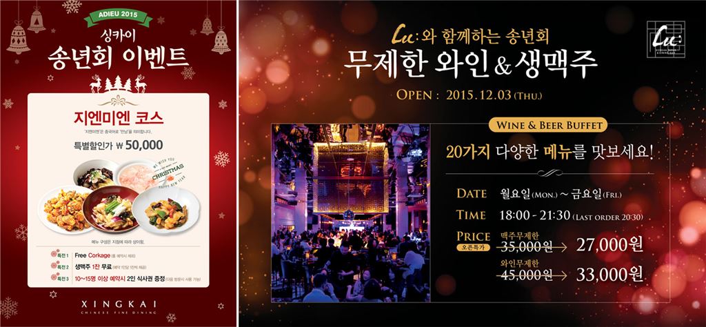 [아시아경제 최서연 기자] 종합식품요리기업 아워홈이 운영하는 ‘싱카이’와 ‘키사라’, ‘루’ 등 4개 고급 외식브랜드들이 본격적인 연말 시즌을 맞이해, 1인당 5만원 이하의 합리적인 금액으로 송년회를 즐길 수 있는 ‘아듀 2015’ 프로모션을 이달 말까지 공동 진행한다고 3일 밝혔다. 중식 파인다이닝 레스토랑 싱카이와 프리미엄 일식 레스토랑 키사라는 광화문과 여의도, 강남 등 서울 소재 6개 지점에서 각 지점별 인기 메뉴들로 선별한 6~9가지 구성의 송년 특별 코스요리를 4만5000원 혹은 5만원에 한정 판매한다. 싱카이와 키사라는 송년 특별코스를 주문하는 고객을 위해 풍성한 특전을 준비했다. 해당 코스를 주문하는 모든 고객에게 생맥주를 1인당 1잔씩 무료로 제공하며, 10~15명 단체 예약 시에는 2인 무료 식사권 1매를 증정한다. 홀 이용객의 경우, 외부에서 술을 가져와도 별도의 서비스 비용이 부과되지 않는 ‘콜키지 프리(Corkage free)’ 혜택을 받을 수 있다. 최근 복합문화공간인 ‘소셜 컬쳐 베뉴’로 변신한 코엑스 루는 대관이 없는 평일 저녁 6시부터 밤 9시30분까지 17가지 고급와인과 신선한 생맥주를 무제한으로 즐길 수 있는 디너 뷔페 프로모션을 마련했다. 루의 시그니처 메뉴인 ‘12첩 마른안주’와 ‘포두부 보쌈’, ‘된장맥적 피자’, ‘간장 등갈비구이’ 등 총 20가지로 뷔페 코너는 식사와 안주를 모두 겸할 수 있는 다채롭고 풍성한 구성을 자랑한다. 루는 연말모임을 준비 중인 고객들을 위해 이달까지 와인 뷔페는 기존 4만5000원에서 3만3000원, 맥주 뷔페의 경우 3만5000원에서 2만7000원으로 할인해준다. 단, 대관행사가 있는 경우 뷔페를 운영하지 않을 수 있기 때문에, 사전 예약(02-6002-2003~4)이 필수다. 오리옥스 여의도점의 경우 대형 플레이트를 활용한 이색 메뉴 ‘빅 해피 와일드플레이트’로 고객들의 눈과 입을 동시에 사로잡을 예정이다. 빅 해피 와일드플레이트는 매콤닭강정, 모둠소시지, 훈제족발 등 13여 개에 이르는 안주들을 지름 59㎝의 원형 플레이트에 한데 담아내 골라 먹는 재미를 선사한다. 생맥주 피처(2000㏄) 2개를 함께 세트로 구성해 푸짐함을 더했다. 12월 한 달간 빅 해피 와일드플레이트의 판매가는 정가보다 20% 저렴한 7만6700원에 제공한다. 최서연 기자 christine89@asiae.co.kr<ⓒ세계를 보는 창 경제를 보는 눈, 아시아경제(www.asiae.co.kr) 무단전재 배포금지>