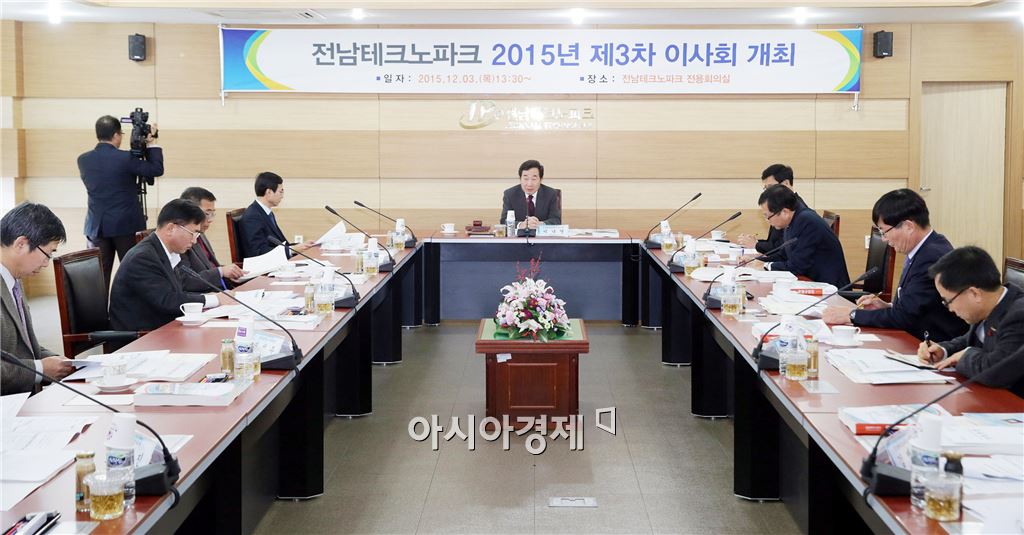 전남테크노파크 이사회가 3일 순천 테크노파크 회의실에서 열린 가운데 이낙연 전남지사가 인사말하고 있다. 김병일 전남테크노파그 원장, 이재철 목포부시장 이사와 감사 18명이 참석해 경영계획 보고 등 10건의 안건을 토의했다. 사진제공=전남도