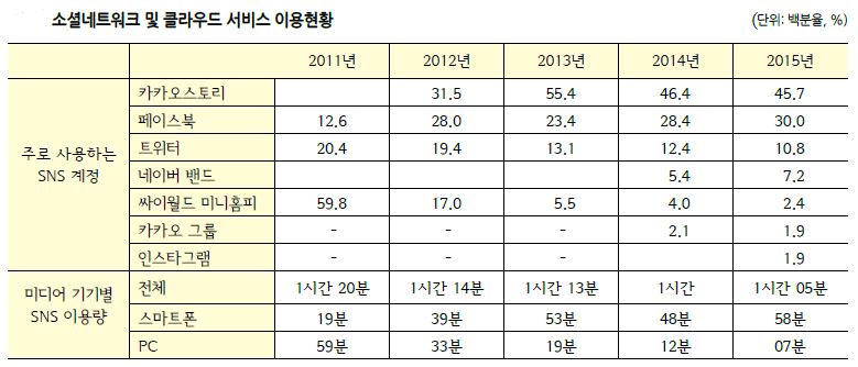 [아시아경제 심나영 기자]우리나라 국민들이 가장 즐겨쓰는 소셜네트워크서비스(SNS)는 카카오스토리로 나타났다.페이스북이 카카오스토리를 바짝 뒤쫓으며 양강 구도를 형성하고 있다. 4일 정보통신정책연구원이 발표한 '2015년 미디어보유와 이용행태 변화' 보고서에 따르면 국민들이 사용하는 SNS계정으로 카카오스토리(45.7%)를 가장 많이 꼽았다. 페이스북은 30%로 2위를, 트위터와 네이버 밴드는 각각 10.8%와 7.2%로 3위와 4위를 차지했다. 페이스북은 2013년부터 카카오스토리와의 격차를 좁히며 1위 자리를 넘보고 있다. 페이스북은 지난 2013년 23.4%, 2014년 28.4%, 올해 30.0% 등 매년 이용자가 증가하고 있다. 반면 트위터 이용률은 매년 감소하고 있다. 카카오스토리가 생기기 전인 2011년 트위터 이용자는 20.4%에 달했지만 올해는 10.8%까지 감소했다. 2011년 59.8%를 차지했던 싸이월드 미니홈피는 올해 2.4%를 기록, 사실상 SNS로서의 기능을 상실했다. 카카오톡은 단순 메신저로 분류돼 이번 조사 대상에서 빠졌다. 올해 미디어 기기별 SNS 이용 시간은 1시간5분으로 집계됐으며 이중 스마트폰이 58분을 차지했다. PC의 경우 7분에 그쳤다. 이는 사용자 대부분이 PC가 아닌 스마트폰을 이용, SNS를 한다는 뜻이다. 이번 조사는 정보통신정책연구원이 올해 전국 16개 시도 5000여 가구와 가구원 1만2000여명을 대상으로 미디어패널조사를 실시한 것을 바탕으로 도출했다.심나영 기자 sny@asiae.co.kr<ⓒ세계를 보는 창 경제를 보는 눈, 아시아경제(www.asiae.co.kr) 무단전재 배포금지>