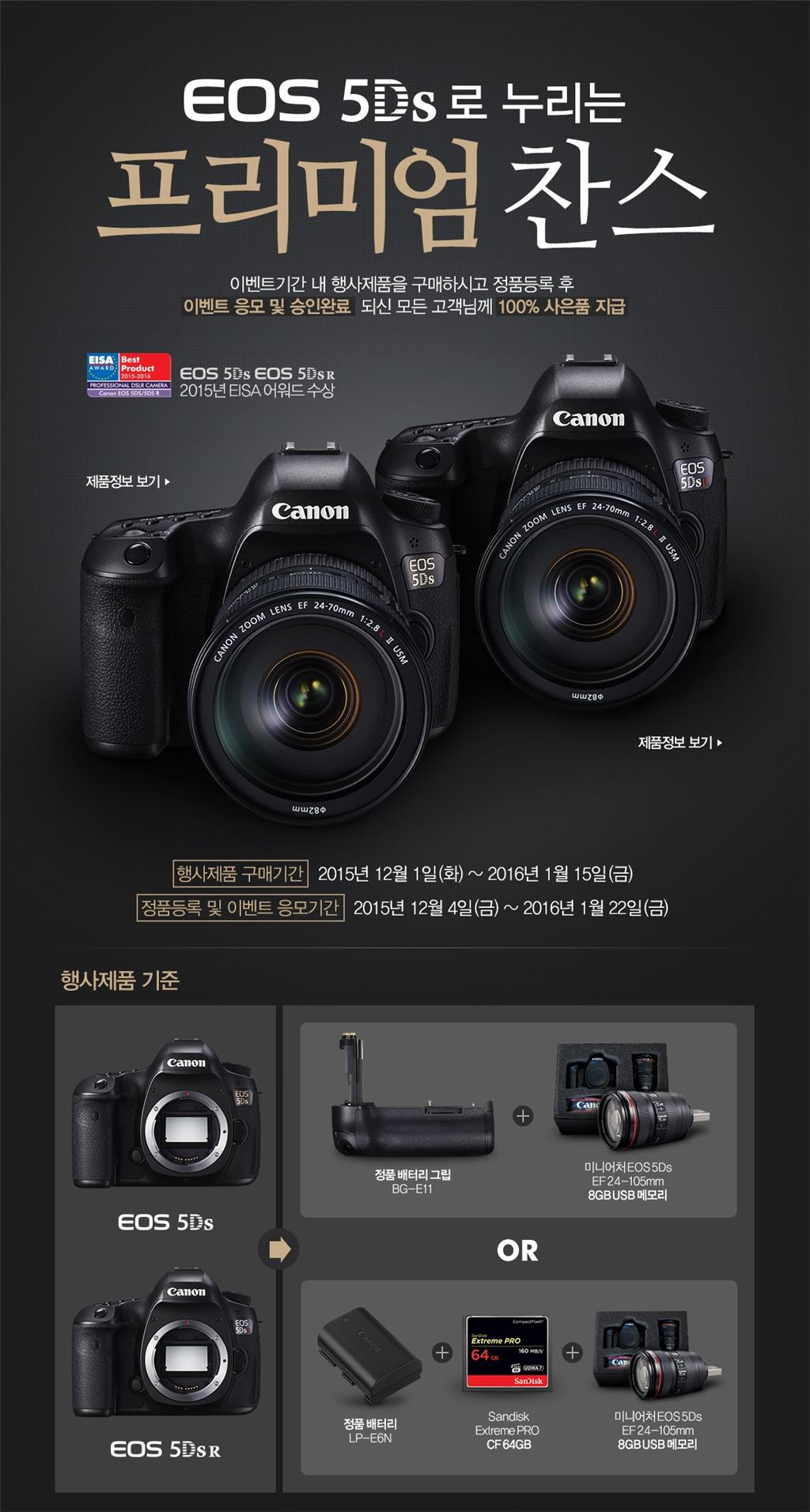 캐논, 'EOS 5Ds'와 'EOS 5Ds R' 구매고객대상 정품등록 이벤트내년 1월15일까지 제품구매 후 정품 등록·이벤트 응모한 고객 대상[아시아경제 김유리 기자] 캐논코리아컨슈머이미징이 내년 1월15일까지 'EOS 5Ds' 또는 'EOS 5Ds R'을 구매한 고객을 대상으로 특별한 선물을 증정하는 'EOS 5Ds로 누리는 프리미엄 찬스' 이벤트를 진행한다고 4일 밝혔다.캐논은 EOS 5Ds 또는 EOS 5Ds R 제품 구매를 고려하고 있는 고객들에게 더 많은 혜택을 제공하고자 촬영 현장에서 꼭 필요한 DSLR 액세서리를 증정하는 정품 등록 프로모션을 마련했다.EOS 5Ds와 EOS 5Ds R은 올해로 출시 10주년을 맞이한 EOS 5D 시리즈에 새롭게 추가된 고화소 제품 라인업으로 세계 최초 약 5,060만 화소의 고해상도 풀프레임 CMOS 센서를 탑재한 DSLR 카메라다. 뛰어난 해상도를 바탕으로 피사체의 질감까지 생생하게 사진으로 표현할 수 있으며, 듀얼 디직 6(Dual DIGIC6) 영상처리엔진을 탑재해 고해상도 이미지를 빠르고 정밀하게 처리할 수 있어 '극사실주의를 실현한 카메라'로 불리고 있다.두 카메라는 지난 8월 유럽의 권위 있는 영상?음향 관련 시상식인 'EISA 어워드 2015-2016'에서 유로피안 프로페셔널 DSLR 카메라 부문 최고상을 수상하기도 했다.내년 1월15일까지 EOS 5Ds 또는 EOS 5Ds R을 구매 후 1월22일까지 캐논 공식 홈페이지에 정품 등록 및 이벤트 응모를 완료하면 된다. 참가자 전원에게 리미티드 에디션으로 제작된 'EOS 5Ds의 미니어처 8GB USB 메모리'와 함께 '정품 배터리 그립(BG-E11)' 또는 '정품 배터리(LP-E6N)와 64GB CF 메모리'의 구성 중 고객이 직접 선택한 사은품을 추가 제공한다.자세한 사항은 캐논코리아컨슈머이미징 공식 홈페이지() 내 이벤트 페이지를 통해 확인할 수 있다.김유리 기자 yr61@asiae.co.kr<ⓒ세계를 보는 창 경제를 보는 눈, 아시아경제(www.asiae.co.kr) 무단전재 배포금지>