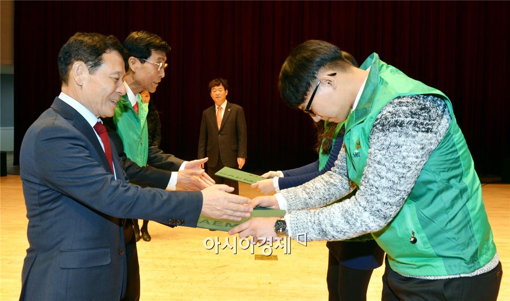 윤장현 광주광역시장은 4일 오후 시청 3층 대회의실에서 시, 구새마을회장, 새마을지도자, 시민 등 700여 명이 참석한 가운데 열린 ‘광주광역시 새마을지도자대회’에 참석해 우수 지도자에게 표창을 수여하고 기념촬영을 하고 있다. 사진제공=광주시