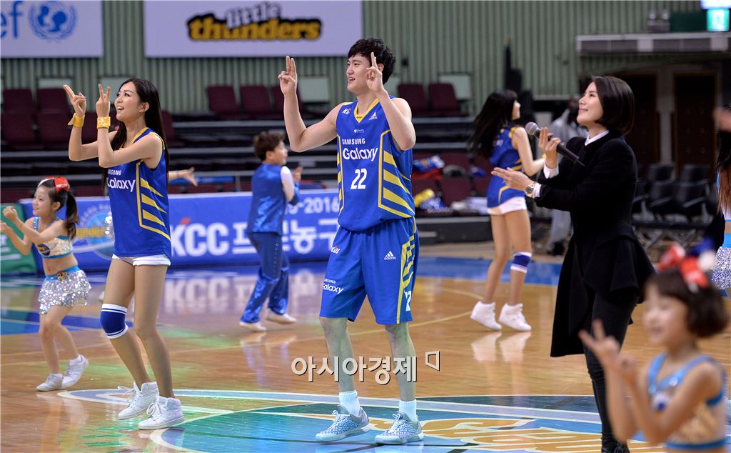 [잠실=아시아경제 김현민 기자] 2015-2016 프로농구 서울 삼성과 인천 전자랜드의 경기가 4일 잠실실내체육관에서 열렸다. 73-62로 승리를 거둔 삼성의 이동엽이 치어리더와 함께 댄스 세리머니를 하고 있다. 김현민 기자 kimhyun81@asiae.co.kr<ⓒ세계를 보는 창 경제를 보는 눈, 아시아경제(www.asiae.co.kr) 무단전재 배포금지>