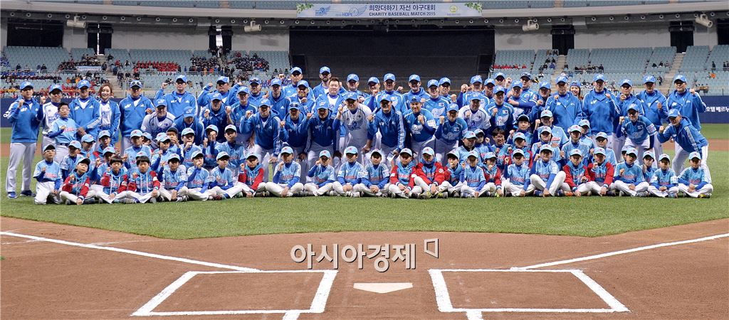 [고척=아시아경제 김현민 기자] 2015 희망더하기 자선 야구대회가 6일 고척스카이돔에서 열렸다. 양팀 선수들이 경기에 앞서 기념사진을 찍고 있다. 김현민 기자 kimhyun81@asiae.co.kr<ⓒ세계를 보는 창 경제를 보는 눈, 아시아경제(www.asiae.co.kr) 무단전재 배포금지>