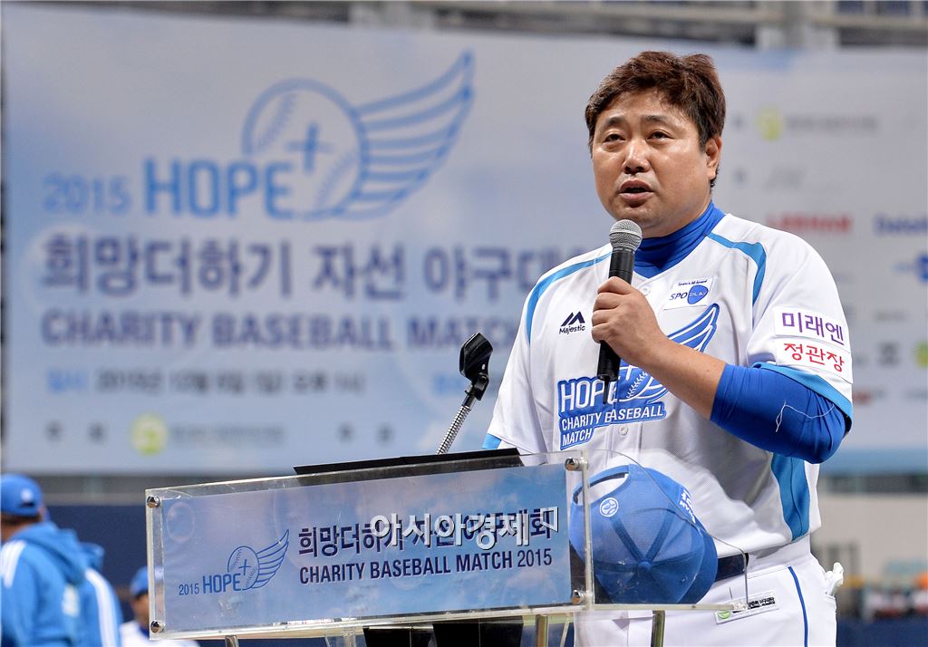 [고척=아시아경제 김현민 기자] 2015 희망더하기 자선 야구대회가 6일 고척스카이돔에서 열렸다. 양준혁 이사장이 개회사를 하고 있다. 김현민 기자 kimhyun81@asiae.co.kr<ⓒ세계를 보는 창 경제를 보는 눈, 아시아경제(www.asiae.co.kr) 무단전재 배포금지>