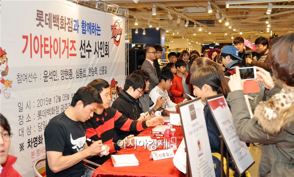 롯데백화점 광주점에서 선수들의 사인회가 진행되자 팬들이 몰려들어 장사진을 이루었다.