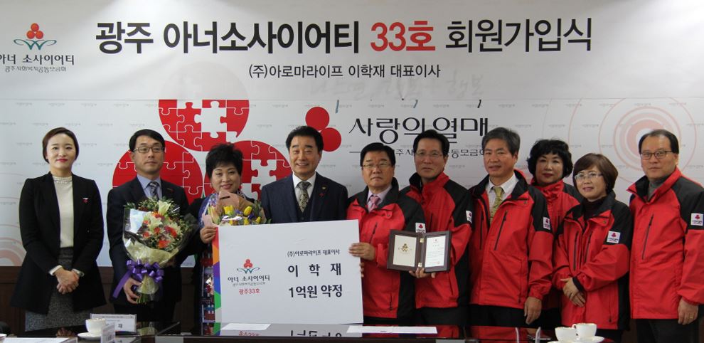 기능성 보정속옷업체 ㈜아로마라이프의 이학재 회장(58)이 지난 4일 오전 광주사회복지공동모금회(회장 김상열) 사무실에서 ㈜아로마라이프 이광은 대표, 이은혜 부사장, 광주공동모금회 김재규 부회장, 문희성 나눔봉사단 총단장 등이 참석한 가운데 1억원 기부를 약정하며 나눔 문화 확산에 동참했다.