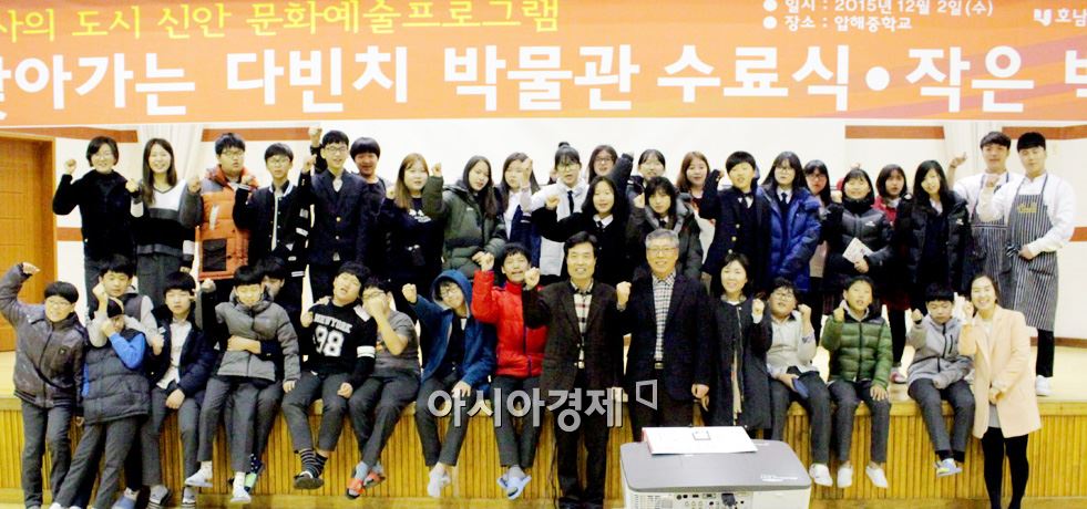 전라남도 지역 문화소외계층에 다양한 문화예술을 체험하도록 돕는 호남대학교 문화예술교육원(원장 장석주)의 ‘찾아가는 다빈치 박물관’이 지난 2일 신안 압해중학교(교장 박종운)에서 성공리에 끝났다. <br />
