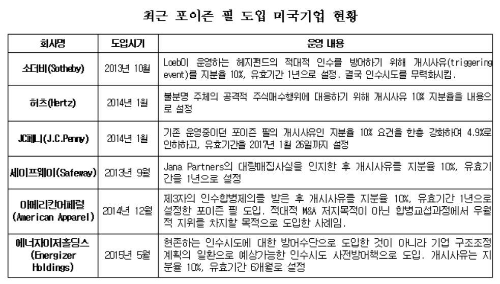 [아시아경제 김혜원 기자] 국내 상장기업에 대한 외국인 지분율이 상승하고 있는 가운데 적대적 인수·합병(M&A)을 방어하기 위해 한국형 포이즌 필(Poison pill) 제도를 도입해야 한다는 주장이 나왔다.포이즌 필은 적대적 인수자가 기업의 주식을 일정 비율 이상 취득할 경우 이사회가 기업의 다른 주주들에게 주식을 저렴한 가격으로 인수할 수 있도록 선택권을 부여하는 제도다. 적대적 인수자가 보유하고 있는 주식 비율을 낮추고 그 가치를 희석시킴으로써 적대적 M&A를 막는 역할을 한다.한국경제연구원(이하 한경연)은 8일 '주요 선진국의 포이즌 필 법제 및 운영현황에 관한 연구' 보고서를 통해 이같이 밝혔다. 한경연은 "최근 국내 우량기업에 대한 외국인 지분율이 급속히 증가하고 있다"며 "외국계 투기자본으로부터 적대적 M&A를 방어하기 위해 미국과 일본 등에서 활용하고 있는 포이즌 필 제도를 도입해야 한다"고 주장했다.지난 3월 기준 국내 코스피 상장사 730개 중 26개 기업의 외국인 지분율은 50%를 초과한 것으로 조사됐다. 또 코스닥 업체 중 외국인 지분율이 50%를 초과한 기업 수는 41개에 달했다. 대표적으로 외국인 지분율이 절반을 넘어서는 기업은 KT&G(55.36%), 이마트(54.59%), 포스코(54.57%), 신세계(52.45%), 네이버(52.28%), 삼성전자(51.45%), 삼성화재(50.52%), SK하이닉스(50.47%) 등이다.한경연은 "외국인 지분율이 증가하면서 외국계 투기자본에 의한 적대적 M&A 가능성도 높아지는 등 기업시장 환경이 변화되고 있다"며 "방어 수단을 마련하기 위해 2009년 상법 개정 시 논의된 한국형 포이즌 필 제도 도입을 재검토해야 한다"고 강조했다.현재 우리나라는 적대적 M&A가 발생할 경우 ▲주주총회 소집을 통한 재무구조 개편이나 주요 자산의 매각 ▲회사 분할을 비롯한 자산 구조조정 ▲자기주식의 취득 한도 확대 등의 장치를 통해 방어하고 있다. 또 집중투표제 배제, 이사 수 축소, 시차임기제 도입, 제3의 우호세력에 대한 신주나 전환사채 발행 허용, 황금낙하산 전략 등의 방어 수단을 정관에 넣고 있다.문상일 인천대 교수는 "현재 운용되는 방어 장치는 비용과 시간이 많이 소요되고 주가 조작 등 위법 가능성은 물론 기업의 재무구조가 악화될 위험성도 존재한다"며 "적대적 M&A를 방어하는 데 한계가 있다"고 지적했다.이어 "포이즌 필 제도는 기업의 추가 비용 부담을 최소화해 빠르게 발동할 수 있고, 실행하지 않더라도 기업 이사회의 협상력을 제고시키는 등 기업가치 유지와 일반주주들 이익 극대화에 효과적이므로 제도 도입 검토가 시급하다"고 말했다.다만 지배주주나 경영진의 사적 이익을 보호하는 수단으로 악용되지 못하도록 적법성 판단 기준을 명확하게 설정하고 사전적·사후적 통제 장치가 효율적으로 작동하도록 대책을 마련해야 한다고 덧붙였다.미국의 경우 기업이 포이즌 필을 도입해 적대적 인수 시도를 무력화시키는 사례가 증가하는 추세다. 2010년 유카이파와 리지오 판결에서 포이즌 필의 적법성을 재확인했고, 이후 소더비, 허츠, JC페니, 세이프웨이, 아메리칸어패럴, 에너자이저 홀딩스 등 많은 미국 기업들이 포이즌 필을 도입·운영하고 있다.일본은 2005년 6월 신회사법을 통해 신주예약권이라는 일본식 포이즌 필 제도를 도입했다. 이후 2007년까지 일본증권거래소에 상장된 4000여개 기업 중 10%에 해당하는 기업이 신주예약권제도를 도입했다. 현재까지 574개 기업이 포이즌 필을 운영하고 있으며 올 상반기에도 7개 기업이 해당 제도를 도입했다.일본에서 신주예약권제도의 적대적 M&A 방어 기능을 처음으로 인정받은 사례는 2007년 불독소스 사건 판결이다. 당시 외국계 펀드인 스틸파트너스가 불독소스를 적대적으로 인수하려는 과정에서 불독소스가 채택한 신주예약권제도의 위법성을 놓고 법정 다툼이 벌어졌다. 하지만 일본최고재판소는 신주예약권제도가 주주평등의 원칙을 침해한 것으로 볼 수 없고 스틸파트너스 측의 인수 후 경영 계획이나 탈출전략에 대한 입증이 없었다는 점을 근거로 적법성을 인정했다.김혜원 기자 kimhye@asiae.co.kr<ⓒ세계를 보는 창 경제를 보는 눈, 아시아경제(www.asiae.co.kr) 무단전재 배포금지>