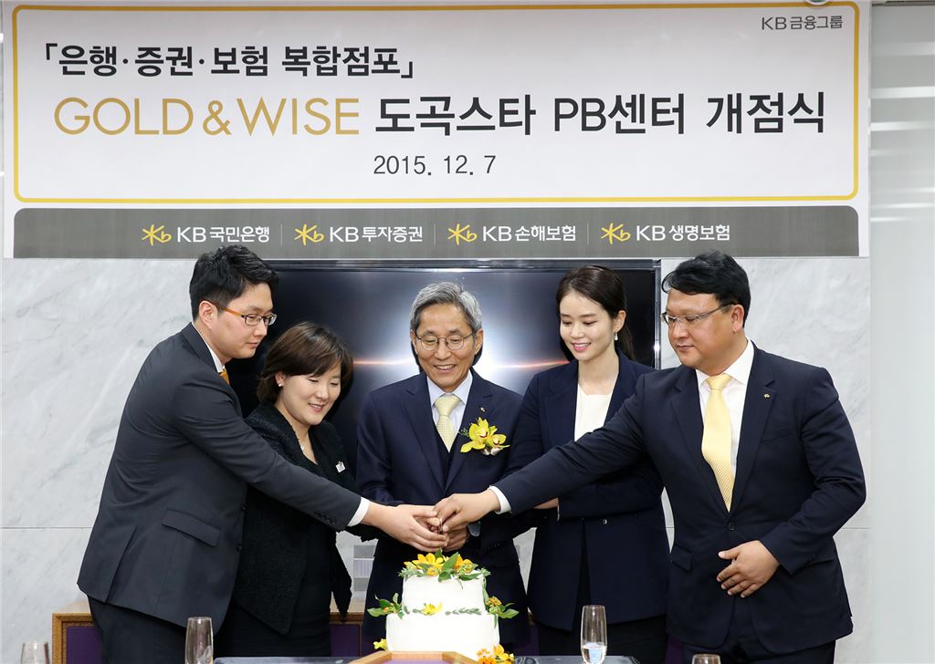 윤종규 국민은행장(가운데)이 도곡스타PB센터 오픈식에 참석해 관계자들과 케이크 커팅을 하고 있다. <br />