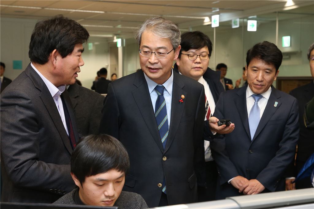 임종룡 금융위원장(오른쪽 세 번째)은 7일 오후 서울 종로구 그랑서울 KEB하나은행 본점에 위치한 '핀테크 원큐랩'에 방문해 관계자들과 대화를 나누고 있다.