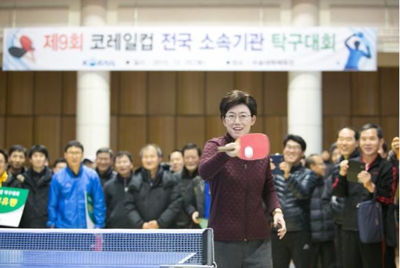 최연혜 코레일 사장이 ‘코레일컵 전국 소속대항 탁구대회’에 참석해 경기가 시작되기 전 친선경기를 펼치고 있다. 코레일 제공