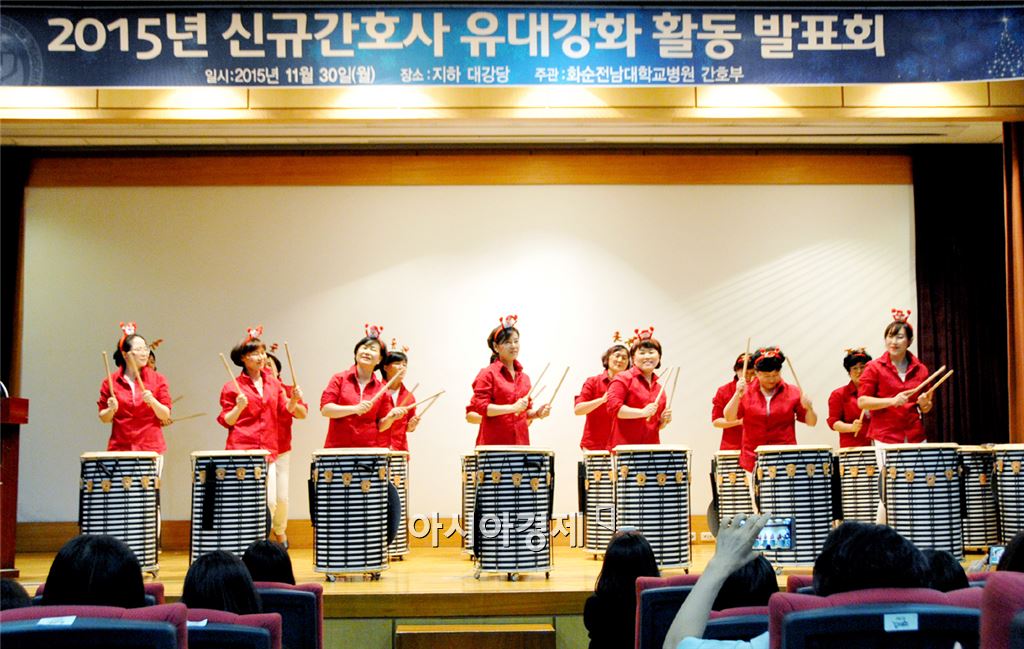 " ‘신규 간호사 유대강화활동 발표회’열려""선배들 격려메시지·난타공연…활력 쑥쑥 " [아시아경제 노해섭 기자]새내기 간호사들의 성공적인 적응을 격려하고 환영하는 행사가 열려 눈길을 끌었다. 화순전남대학교병원 간호부(부장 박숙령)은 지난달 30일 병원내 지하대강당에서 '2015년 신규 간호사 유대강화활동 발표회’를 열었다. 이 자리에선 올해 입사한 김현지 간호사 등 32명의 신입 간호사들이 소개됐고, 이들에 대한 격려 메시지도 전달돼 훈훈함을 더했다. 수개월간 프리셉터 역할을 맡았던 경력 간호사들의 정감어린 덕담이 이어져 웃음꽃을 피웠다. 프리셉터란 신규간호사들이 간호업무에 잘 적응할 수 있도록 1:1교육을 통해 업무역량을 키워주는 경력간호사를 지칭한다. 신규 간호사들은 실무교육기간 동안의 열정적인 지도에 감사하는 편지를 낭독했고, 수간호사들은 2개월간 연습한 난타공연으로 화답하며 이들을 응원했다. 내과계 중환자실에서 근무하는 김태희 신규 간호사는 “환대에 감사드린다. 따뜻한 언니처럼 소통하고 챙겨주는 선배들이 많아 업무에 잘 적응하고 있다”면서 “더욱 많이 배우고 익혀 전문성을 겸비한 든든한 일원으로 성장하고 싶다”며 환하게 웃었다. 박숙령 간호부장은 “선배들의 좋은 가르침을 바탕으로 멋진 간호사, 화순전남대병원의 보배로 오래도록 남아주기를 기대한다”고 말했다.화순전남대병원 새내기 간호사들과 이들을 지도한 선배 간호사들이 함께 기념촬영하고 있다.