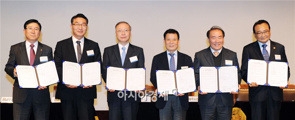 윤장현 광주광역시장은 9일 오후 광주지방검찰청 9층 대회의실에서 전남도, 시·도 교육청, 광주지방검찰청, 광주·전남 기초지자체, 청소년 기관, 시민단체 등 27개 기관이 참여한 ‘청소년 선도보호 광주?전남지역 시민네트워크 협약’을 체결하고 기념촬영을 하고 있다. 이날 협약에 따라 참여기관들은 앞으로 청소년을 선도 보호할 수 있는 범시민 안전망을 구축하는 데 힘을 모으기로 했다.선태무 전남도교육청 부교육감, 우기종 전남도 정무부지사, 김해수 광주지방검찰청 검사장, 윤장현 광주광역시장, 장휘국 광주시 교육감, 이주현 법사랑위원 광주지역연합회장[왼쪽부터] 사진제공=광주시
