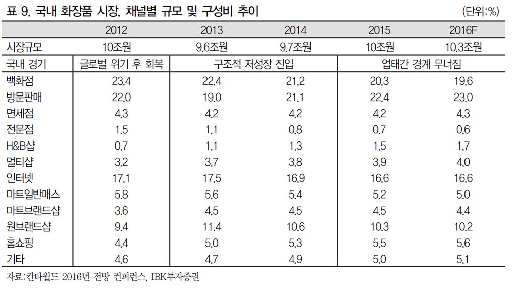 내년 화장품업계 옥석가리기 시작될 것…중국 시장은 여전히 매력적면세점과 홈쇼핑 의존도 줄고 방판과 전문점으로 확대[아시아경제 이초희 기자]내년 화장품 시장은 중국 사업의 성장성에 주목해야 한다는 전망이다. 면세점과 홈쇼핑 의존도는 약화되는 반면 방문판매와 전문점으로 균형이 확대될 것이라는 분석이다. 안지영 IBK투자증권 연구원은 "2014년, 2015년간 성장성은 중소 브랜드숍보다 면세점과 인터넷, 홈쇼핑 등에 집중돼 왔다"며 "그러나 2016년은 국내는 채널 전반적으로 안정성장을 예상한다"고 말했다.지난 상반기 중동호흡기증후군(메르스) 영향으로 주춤했지만 중국인 관광객(요우커)의 절대적 규모가 연간 600만명을 상회하며 정부의 내국인 면세한도 상향(600달러) 시행과 2016년 면세점 공급이 증가하기 때문이라는 설명이다.아모레퍼시픽과 LG생활건강 중심의 대형 화장품 업체들은 2015년 4분기 이후 면세점부문의 기저효과가 축소됨에 따라 면세점이 주도했던 성장성은 둔화될 것으로 예상했다. 2015년 방문판매가 역신장에서 성장으로 증가 반전을 보였고 최근 안정성장을 유지하고 있으며, 할인점은 2016년엔 4년차 기저효과가 가능한 것으로 추정되기 때문이라고 설명했다. 그러나 지난 3년간 홈쇼핑에 집중된 점과 국내 브랜드숍 시장은 신규 출점의 부담은 존재한다고 지적했다. 국내 화장품 시장은 전반적으로 합리적인 소비문화 정착에 따른 채널 및 브랜드 트레이딩 다운 소비가 20~30대 소비자를 중심으로 정착된 반면 구매력이 높은 50~60대의 실버세대의 고가 채널 내 선호도가 수입 브랜드에서 국산 브랜드로 이전됨에 따라 백화점과 방문판매 채널에 대한 방어력을 높일 것으로 내다봤다. 안 연구원은 화장품업체들에게 중국은 전 세계에서 가장 매력적인 시장이라고 설명했다. 그는 "2014년 면세점과 대형업체 화장품의 독보적인 성장 공식은 요우커 수혜라는 추세적인 변수의 힘을 크게 반영했다"며 "그러나 국내 면세점의 급격한 성장과 트렌디한 중국인 수요에 대한 변수는 향후 환율, 항공 화물의 공급 능력 등의 불확실성도 확산되는 시점에 있다"고 말했다.세계 1위의 인구 상황과 경제성장의 단계를 고려할 때 글로벌 화장품 성장의 키는 중국 시장에서의 포지셔닝 여부에 영향을 받을 수 밖에 없다고 밝혔다. 안 연구원은 "중국 정부의 자국 산업 보호를 위한 화장품과 관련된 규제는 한 층 더 강화될 가능성이 높아 보인다"며 "따라서 중국 내 공장 설비를 확대하고 중국 내수 기업과 거래를 확대하며 중국 내 포지셔닝을 강화하고 있는 기업의 우위는 더욱 확고해질 전망"이라고 전했다.이초희 기자 cho77love@asiae.co.kr<ⓒ세계를 보는 창 경제를 보는 눈, 아시아경제(www.asiae.co.kr) 무단전재 배포금지>