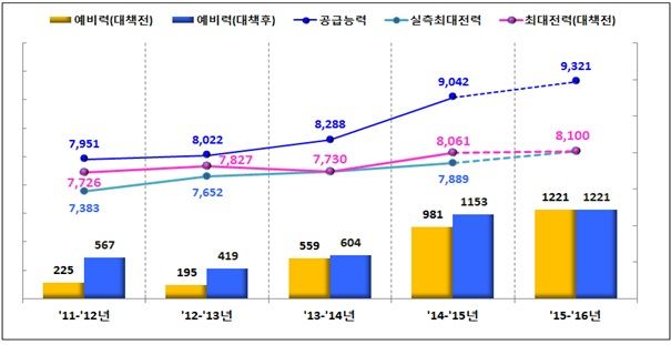 [아시아경제 오현길 기자] 올 겨울 전력수요가 역대 최대를 기록하겠지만 전력수급은 안정적인 전망이다.10일 산업통상자원부가 발표한 겨울철 전력수급 전망 및 대책에 따르면 올 겨울 최대 전력수요는 8100만㎾로 작년 겨울보다 39만㎾가 증가할 전망이다.겨울철 날씨는 온화할 전망이다. 기상청에 따르면 이달 기온이 평년과 비슷하며 내년 1~2월에도 평년과 비슷하거나 높을 전망이다. 강수량은 평년과 비슷하지만 이달에는 다소 많을 것으로 보인다.다만 산업부는 이상한파 등으로 인한 난방수요가 급증하면 최대 8300만㎾까지 발생할 수 있을 것으로 예상했다.최대전력공급 능력은 9321만㎾로 작년 보다 385만㎾를 더 확보했다. 이에 최대수요시 예비전력은 1221만㎾에 달할 전망이다. 이상한파나 대형발전기 불시정지, 송전선로 이상 등 돌발상황이 없으면 안정적인 전력수급 관리가 가능하다고 설명했다.특히 산업부는 내년 2월까지 동계전력수급 대책기간으로 정하고 만일의 사태가 발생할 경우에도 수급차질이 발생하지 않도록 비상계획을 마련하는 등 철저히 대비하기로 했다.특히 엘니뇨로 인한 폭설 등 기상이변에 대비, 고장빈도가 높고 고장시 전력수급에 미치는 영향이 큰 발전소와 송변전설비에 대한 특별점검을 실시했다.이외에도 수요자원 거래시장에 등록된 289만㎾를 활용, 자발적인 전력수요 감축을 유도키로 했다. 또 석탄화력발전기 출력상향 운전 84만㎾, 내년 상반기 준공 예정인 발전기의 시운전 출력 활용 48만㎾의 공급능력을 추가 확보하는 등 총 421만kW의 추가 예비력을 확보했다고 설명했다.비상대책으로는 주의·관심단계에서는 민간 자가발전기 최대가동, 열병합 발전기 전기출력 최대운전, 전압 하향조정, 공공부문 보유 비상발전기 가동 등 185만㎾를 추진한다. 주의·경계단계에서는 석탄화력발전기 최대보증출력 운전, 긴급절전 수요감축 등 115만㎾를 확보하고 공공부문 난방기 가동 중지·자율절전을 실시키로 했다.아울러 산업부는 시민단체와 함께 에너지절약 및 나눔 캠페인을 전국적으로 전개, 적정 난방온도(20℃ 이하) 권장, 문 열고 난방영업 자제, 에너지절전 행동요령 전파 등을 통해 에너지절약을 자율적으로 추진토록 할 예정이다.공공기관은 난방온도 18℃ 이상을 원칙으로 건물난방방식, 기관의 특성 등을 감안하여 2℃ 이내에서 탄력적으로 운영하며, 학교나 도서관, 어린이집, 대중교통시설, 문화체육시설 등은 자체적으로 적정 실내온도를 설정할 수 있도록 했다.오현길 기자 ohk0414@asiae.co.kr<ⓒ세계를 보는 창 경제를 보는 눈, 아시아경제(www.asiae.co.kr) 무단전재 배포금지>