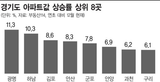[아시아경제 조인경 기자] 올 들어 경기도에서 아파트 값이 가장 많이 오른 지역은 바로 '광명'이다. 연초 대비 최근까지 무려 11.3% 올랐다. 위례와 미사지구 개발로 물이 오른 하남을 1.0%포인트 차로 제쳤다.광명의 집값 상승 일등공신은 단연 스웨덴에서 건너온 가구 유통업체 '이케아' 효과다. 연면적 13만1550㎡, 세계적으로 가장 큰 이케아 매장이 문을 열면서 인근 상권 활성화와 차익 실현에 대한 기대감이 높아져 기존 아파트와 신규 분양 아파트를 불문하고 '사자' 행렬이 이어졌다.여기에 코스트코, 롯데 프리미엄아울렛 등 생활편의시설이 풍부하고 광명역세권과 시흥목감 등 택지지구의 인기, 서울 독산동 대규모 복합단지 조성, 광명 철산동 재건축 사업 활기 등의 개발 호재가 이어졌다.KTX 광명역 외에 전국으로 통하는 '사통팔달' 광역 교통망이 속속 갖춰지고 있는 점도 광명의 투자열기를 더욱 달아오르게 했다.우선 금천영업소~관악IC~사당IC~선암영업소 총 12.4㎞를 잇는 민자도로인 강남순환도시고속도로가 내년 5월 개통한다. 도시균형발전을 기치로 2007년 착공해 8년6개월간의 공사가 마무리되면 수도권 서남부 지역에서 강남 심장부를 원스톱으로 잇는 광역 도로망이 갖춰진다. 또 내년엔 민간투자사업인 수원~광명고속도로도 개통되고 2023년께엔 신안산선이, 2024년엔 월곶~판교 복선전철이 각각 개통될 예정이어서 향후 수도권 서남권을 대표하는 교통의 요지로 자리 잡을 전망이다.이미 지난 10월 말부터 순차적으로 전매제한이 풀리고 있는 광명역세권지구 아파트 분양권에는 현재 6000만~8000만원의 웃돈이 붙었다. 광명에서 가까운 서울 금천구 독산동의 '롯데캐슬' 아파트도 전용면적 84㎡를 기준으로 분양권 시세가 최고 6000만원까지 형성됐다는 게 인근 공인중개업소들의 설명이다.