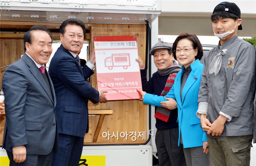 윤장현 광주광역시장은 11일 오전 시청 야외스케이트장 개장식에 참석해 이날부터 영업을 시작한 광주지역 푸드트럭 1호점의 개장을 축하하고 있다.(왼쪽부터 장휘국 시교육감, 조영표 시의회의장, 윤장현 시장, 박혜자 국회의원). 사진제공-광주시