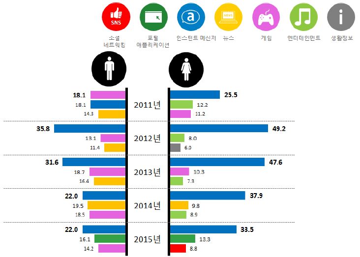 가장 많이 이용하는 애플리케이션 종류 (출처:정보통신정책연구원)