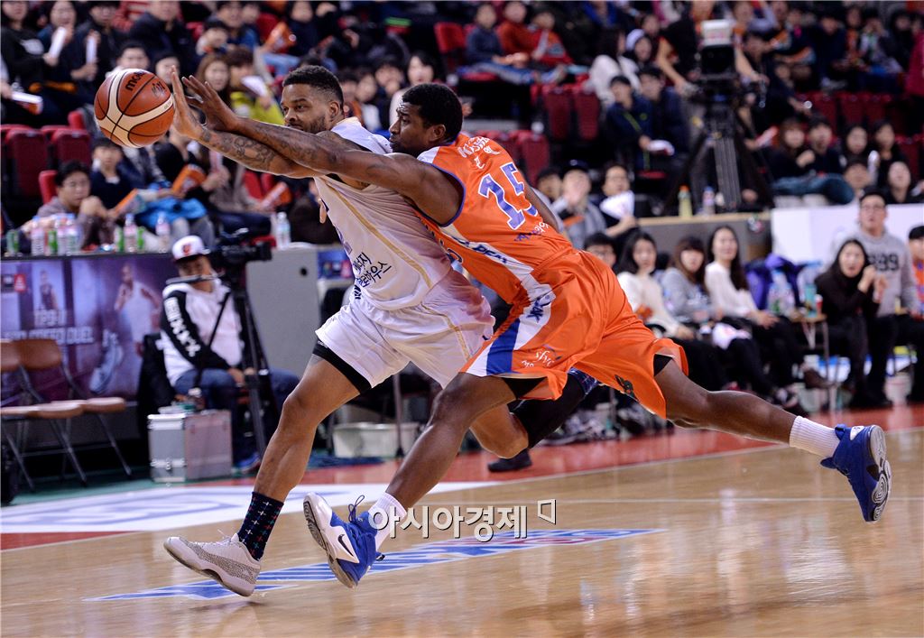 [인천=아시아경제 김현민 기자] 2015-2016 프로농구 인천 전자랜드와 전주 KCC의 경기가 13일 인천 삼산월드체육관에서 열렸다. 전자랜드 포웰이 상대 에밋고 공을 다투고 있다. 김현민 기자 kimhyun81@asiae.co.kr<ⓒ세계를 보는 창 경제를 보는 눈, 아시아경제(www.asiae.co.kr) 무단전재 배포금지>