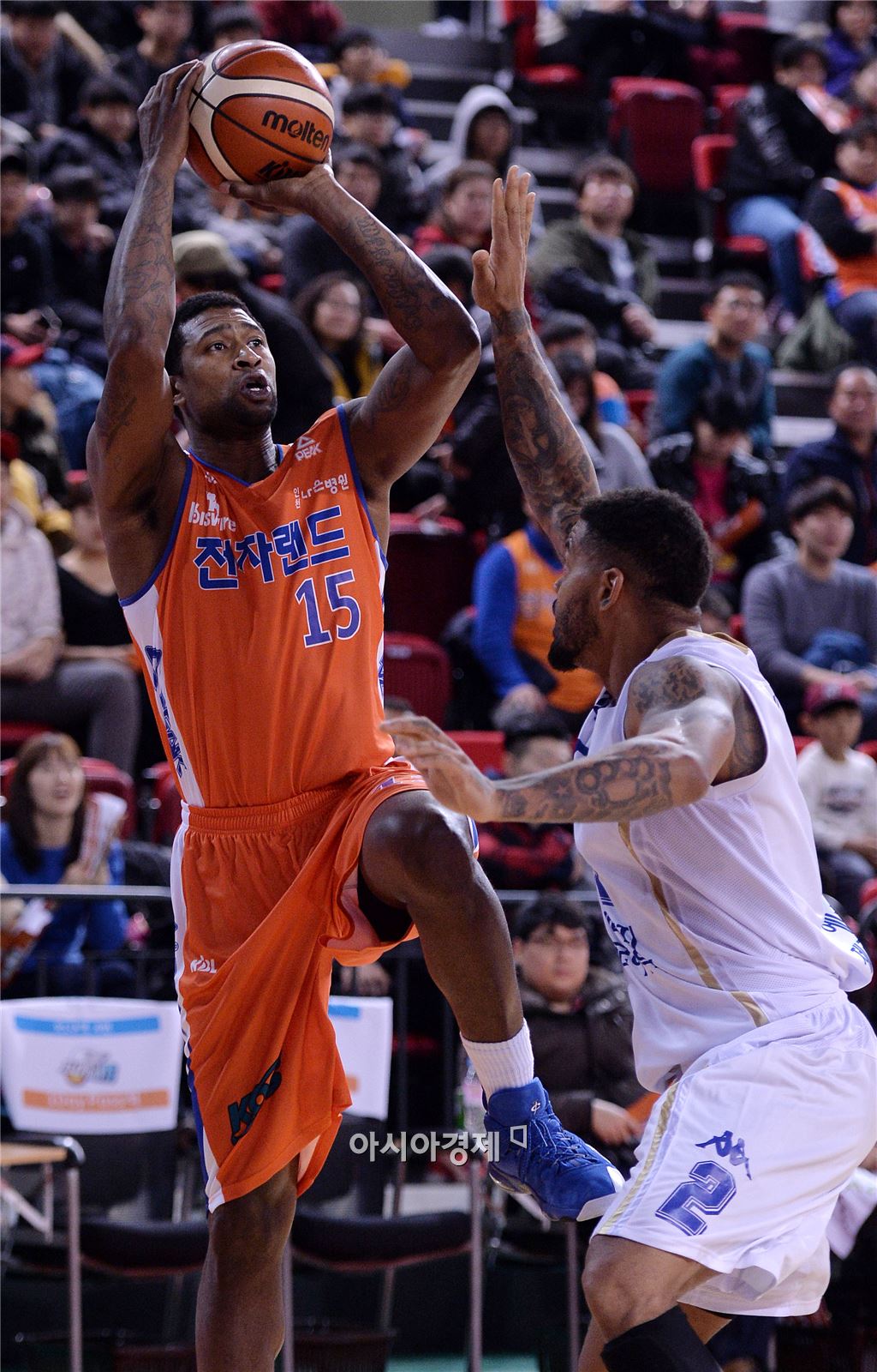 [인천=아시아경제 김현민 기자] 2015-2016 프로농구 인천 전자랜드와 전주 KCC의 경기가 13일 인천 삼산월드체육관에서 열렸다. 전자랜드 포웰이 상대 수비를 뚫고 공격하고 있다. 김현민 기자 kimhyun81@asiae.co.kr<ⓒ세계를 보는 창 경제를 보는 눈, 아시아경제(www.asiae.co.kr) 무단전재 배포금지>