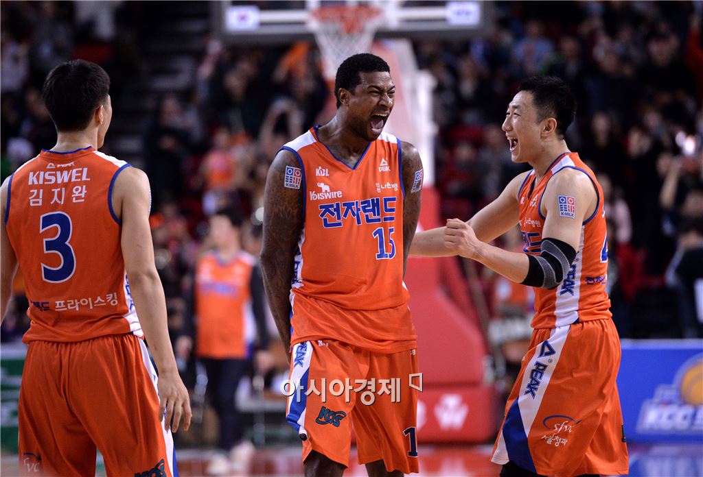 [인천=아시아경제 김현민 기자] 2015-2016 프로농구 인천 전자랜드와 전주 KCC의 경기가 13일 인천 삼산월드체육관에서 열렸다. 전자랜드 포웰이 85-83 승리를 확정한 뒤 정영삼과 기뻐하고 있다. 김현민 기자 kimhyun81@asiae.co.kr<ⓒ세계를 보는 창 경제를 보는 눈, 아시아경제(www.asiae.co.kr) 무단전재 배포금지>