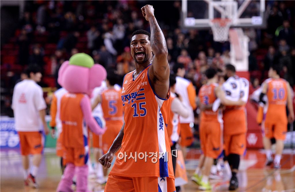 [인천=아시아경제 김현민 기자] 2015-2016 프로농구 인천 전자랜드와 전주 KCC의 경기가 13일 인천 삼산월드체육관에서 열렸다. 전자랜드 포웰이 85-83 승리를 확정한 뒤 기뻐하고 있다. 김현민 기자 kimhyun81@asiae.co.kr<ⓒ세계를 보는 창 경제를 보는 눈, 아시아경제(www.asiae.co.kr) 무단전재 배포금지>