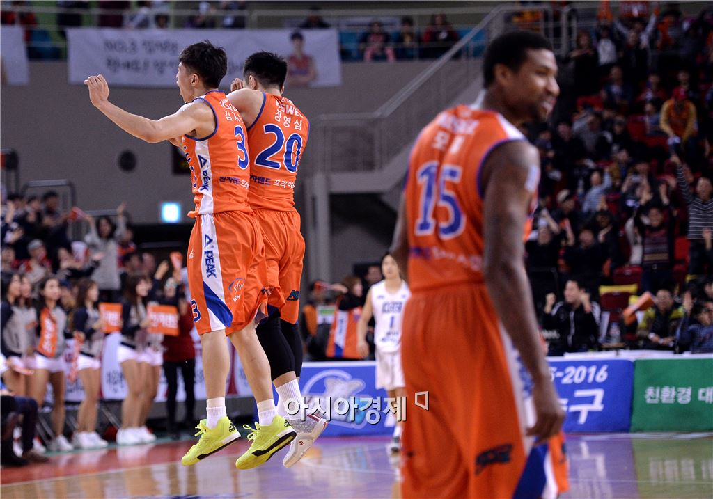 [인천=아시아경제 김현민 기자] 2015-2016 프로농구 인천 전자랜드와 전주 KCC의 경기가 13일 인천 삼산월드체육관에서 열렸다. 전자랜드 정영삼이 3점슛을 성공시킨 뒤 김지완과 세리머니하고 있다. 김현민 기자 kimhyun81@asiae.co.kr<ⓒ세계를 보는 창 경제를 보는 눈, 아시아경제(www.asiae.co.kr) 무단전재 배포금지>