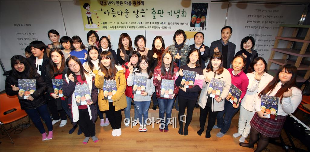 광주시 광산구 수완중학교 학생들이 마을 동화책 ‘아름다운 알음’을 펴내고 기념촬영을 하고있다.