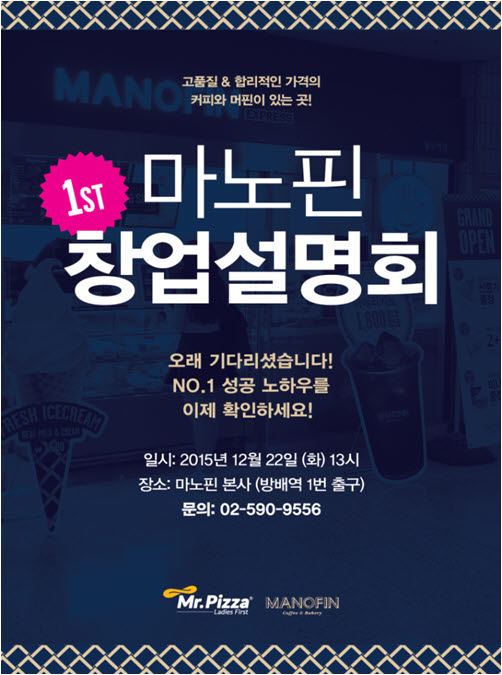 [아시아경제 최서연 기자] MPK그룹이 운영하는 마노핀이 오는 22일 오후 1시 방배동 MPK그룹 본사 사옥에서 창업설명회를 개최한다고 15일 밝혔다. 이번에 처음으로 진행되는 마노핀 창업설명회는 ‘25년간 축척된 가맹점 운영시스템 및 NO.1 성공노하우 전수’를 주제로 합리적인 가격의 100% 아라비카원두 커피, 소형 카페의 매출 한계를 극복할 수 있는 머핀, 베이커리를 공급할 수 있는 자체 R&D, 생산, 유통시스템 등 마노핀만의 경쟁력을 소개한다. 직영점을 중심으로 사업을 운영해온 마노핀은 이번 창업설명회를 통해 가맹사업을 본격화 할 계획이다. 창업설명회 참가신청은 전화(02-590-9556)로 하면 된다. 최서연 기자 christine89@asiae.co.kr<ⓒ세계를 보는 창 경제를 보는 눈, 아시아경제(www.asiae.co.kr) 무단전재 배포금지>