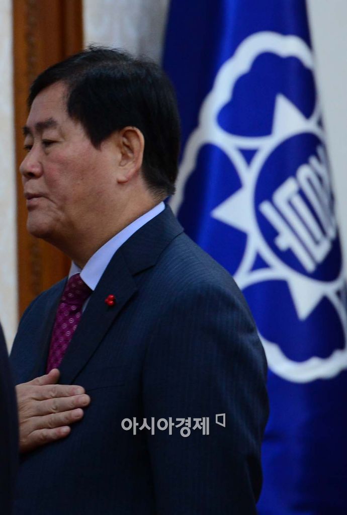 [아시아경제 백소아 기자] 최경환 경제부총리가 15일 서울 세종로 정부서울청사에서 열린 국무회의에서 국기에 대한 경례를 하고 있다. 이날 일부 매체에서는 최 부총리의 인턴 채용 청탁과 관련된 중진공 이사장의 녹취록이 공개되기도 했다.백소아 기자 sharp2046@asiae.co.kr<ⓒ세계를 보는 창 경제를 보는 눈, 아시아경제(www.asiae.co.kr) 무단전재 배포금지>