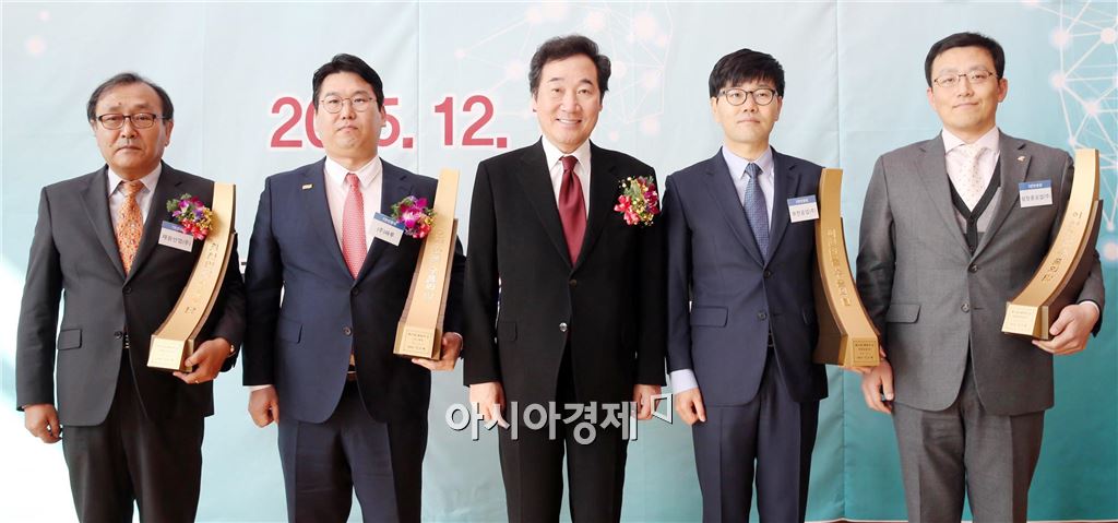 이낙연 전남지사가 15일 오전 영암군 삼호읍 호텔현대에서 열린 제52회 무역의 날 기념식에 참석, 2천만불 이상 수출기업에 대한 수출의 탑을 전수한 뒤 기념촬영을 하고 있다. (왼쪽부터) 7천만불탑 재원산업(주), 5천만불탑 (주)파루, 이낙연 전남지사, 2천만불탑 부천공업(주)ㆍ성창중공업(주). 사진제공=전남도