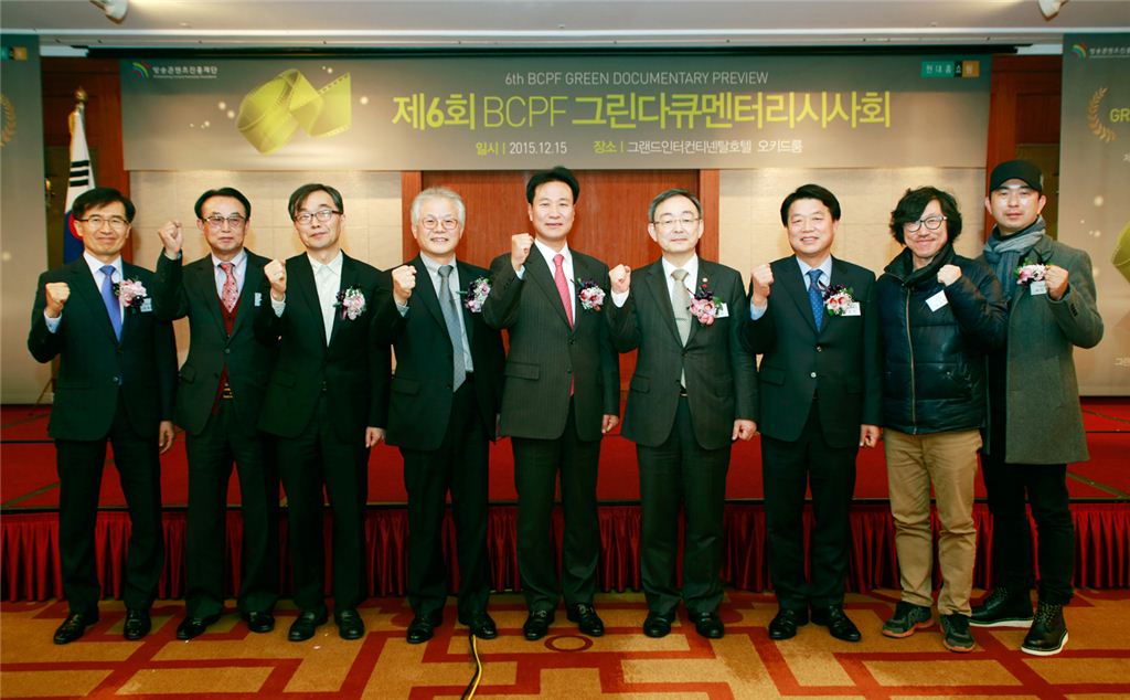 (사진 왼쪽부터)이재호 동아방송대 교수, 김진철 방송콘텐츠진흥재단 상임이사, 허의도 방송통신심의위원회 사무총장, 최종삼 한국케이블TV협회 부회장, 강찬석 현대홈쇼핑 대표, 최성준 방송통신위원회 위원장, 허용범 방송콘텐츠진흥재단 이사장, 김대현 '다방의 푸른꿈' 감독, 서민원 한국독립PD협회 부이사장<br />