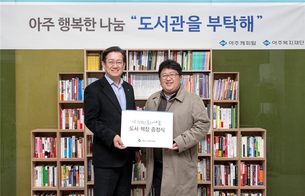 ▲16일 서울 서초구에 위치한 아주캐피탈 본사 로비에서 이윤종 아주캐피탈 사장(왼쪽)이 최선열 비전학교 아동센터 대표에게 임직원이 기부한 도서를 전달하고 있다.