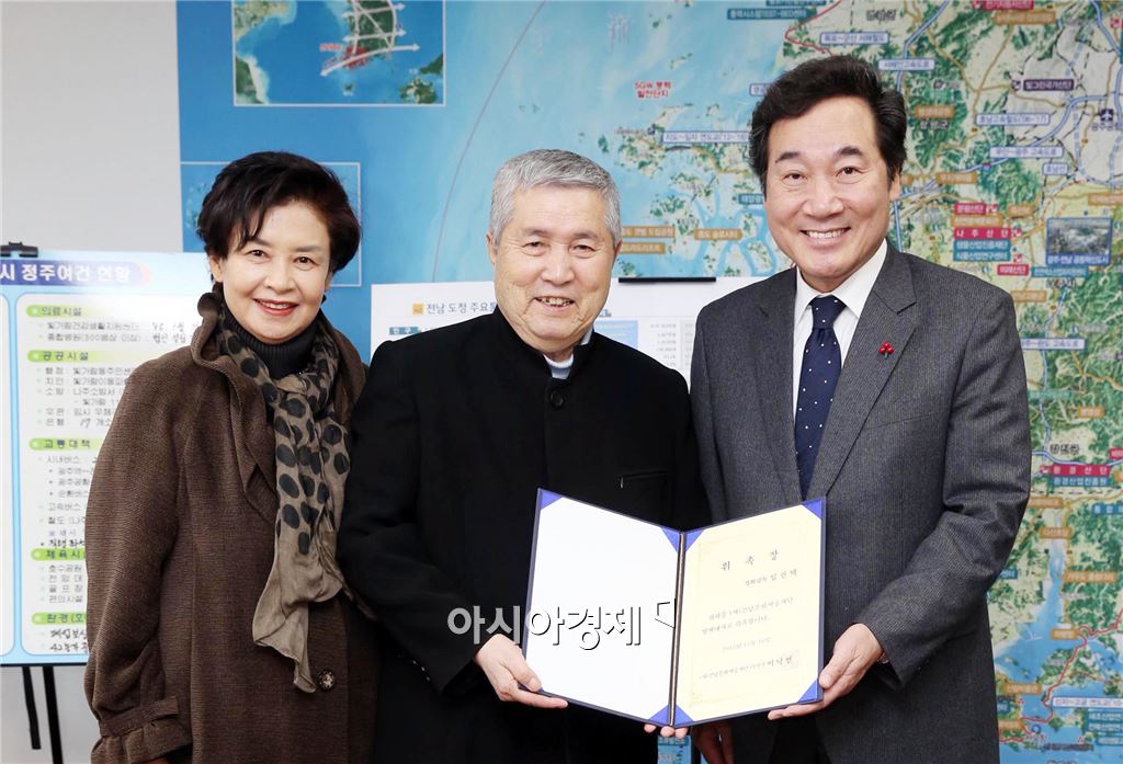 이낙연 전남지사가 16일 오후 집무실에서 서편제와 태백산맥 등 불후의 명작을 남긴 임권택 영화감독(가운데)을 전남문화예술재단 명예대사로 위촉했다. 사진제공=전남도