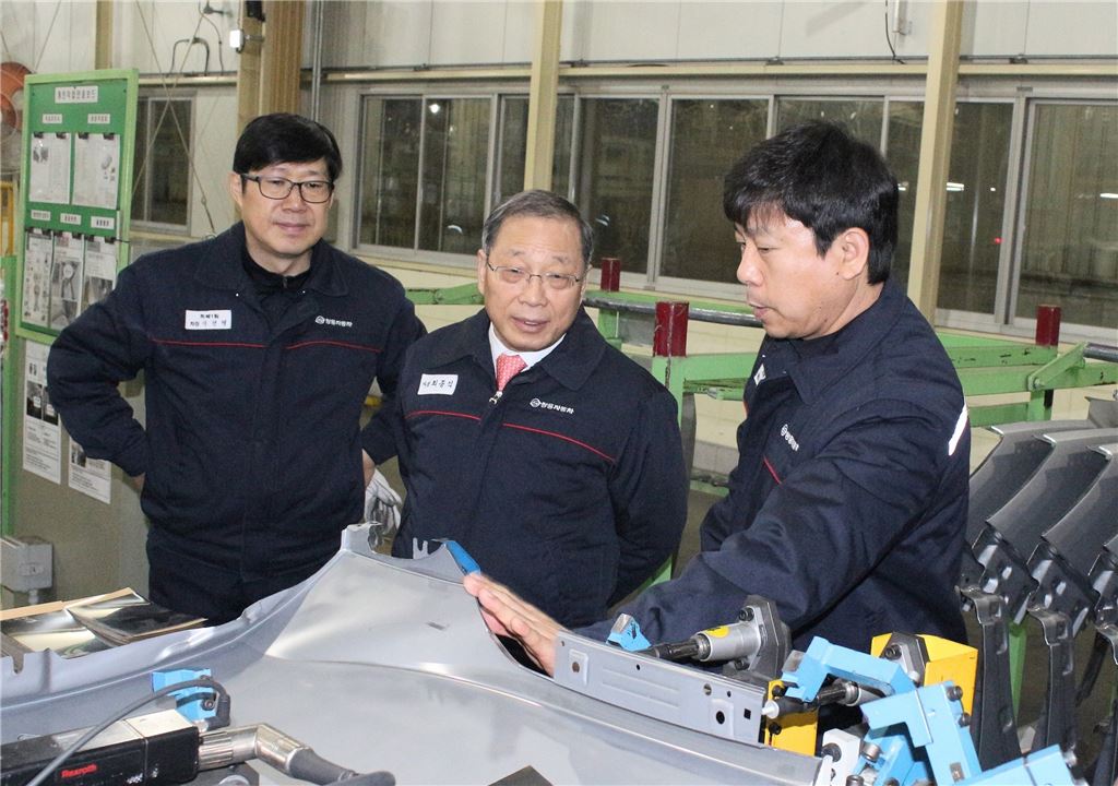 쌍용차는 지난 16일 평택공장에서 스킨십 경영의 일환으로 CEO 한마음 라운드 워크 행사를 가졌다. 최종식 대표이사(가운데)가 최우수분임조로부터 작업 개선 활동에 대한 설명을 듣고 있다.<br /> <br />