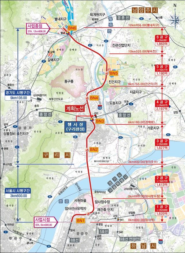 [아시아경제 온라인이슈팀] 지하철 8호선의 연장선인 별내선이 추진 10년 만에 공사에 착수했다.국토교통부와 경기도, 서울시는 17일 경기도 구리시 구리광장에서 지하철 8호선 연장인 별내선 착공식을 열고 본격적인 공사를 시작했다.별내선은 8호선 암사역∼중앙선 구리역∼구리 농수산물도매시장∼다산 신도시∼경춘선 별내역 구간 12.9㎞에 건설되며, 총 1조2806억원이 투입돼 2022년 완공된다. 6개 공구 가운데 1∼2공구 2.6㎞는 서울시가, 3∼6공구 10.3㎞는 경기도가 각각 공사를 맡으며 현재 설계 중이다. 착공식이 열린 구리광장은 별내선 1∼6공구 가운데 공사가 가장 먼저 시작되는 6공구에 속한 곳이다.별내선은 수도권 동북부 광역교통개선책의 하나로 2005년 11월부터 추진됐으며 1년 뒤 예비타당성 심사에서 확정됐다. 그러나 도시철도로 추진할지, 광역철도로 할지 등에 대한 관계기관 간 이견과 노선 갈등 등으로 건설 사업이 늦어졌다.별내선은 시속 80㎞로 설계됐으며 6량 1편성으로 운행된다. 완공되면 별내역에서 서울 잠실까지 기존 노선보다 17분 단축된 27분가량 걸릴 것으로 예상됐다. 또 별내에서 성남 모란까지 갈아타지 않고 지하철을 이용할 수 있으며 지하철 2·3·5호선, 분당선, 중앙선, 경춘선 등도 갈아탈 수 있다.별내선이 개통되면 주변 4개 택지개발지구 18만명을 포함해 인근 55만명이 혜택을 볼 것으로 도는 기대하고 있다.착공식에는 남경필 경기도지사, 윤호중·박창식·최민희 국회의원, 이석우 남양주시장, 구리시장 권한대행 이성인 부시장을 비롯해 도·시의원과 주민 등 200여명이 참석했다.남경필 지사는 “별내선 복선전철이 드디어 첫 삽을 뜨게 됐다”며 “재원 마련과 노선 결정 등 여러 가지 의견 상충으로 사업이 늦어졌지만 2021년 조기 개통을 목표로 신속하고 안전한 철도를 건설하겠다”고 밝혔다.온라인이슈팀 issue@asiae.co.kr<ⓒ세계를 보는 창 경제를 보는 눈, 아시아경제(www.asiae.co.kr) 무단전재 배포금지>