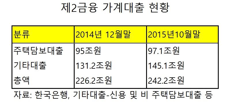 C|02[아시아경제 이은정 기자] 미국의 기준금리 인상으로 제2금융권의 가계대출에 대한 우려의 목소리가 높아지고 있다. 매월 급증하는 은행권의 주택담보대출에 가려져 있지만 제2금융권의 가계 대출도 사상 최고치를 기록하고 있기 때문이다. 제2금융권 대출은 은행에 비해 고(高)금리이고 원리금 상환 조건도 불리한 편이라 보통 악성 부채로 여겨진다. 19일 한국은행에 따르면 지난 10월말 기준 비은행예금취급기관의 가계대출 잔액은 242조2000억원을 기록, 작년말 보다 16조원이 늘었다. 비은행금융기관에는 신용협동기구, 보험사, 저축은행, 여신전문금융회사(여전사) 대출로 제2금융권으로 분류된다. 이 중 주택담보대출 잔액은 97조1000억원으로, 작년말 보다 2조1000억원 늘었고 기타대출 잔액은 145조1000억원으로 13조9000억원이 늘것으로 나타났다. 기타대출은 신용대출과 비주택담보대출로 구성된다. 마이너스 통장과 토지·상가·예금 등 주택 외 다른 자산을 담보로 한 대출 등이다. 제2금융권에서 집을 담보로 하는 주택 담보대출보다는 신용대출 등에 대한 신청자가 늘어 사상 최대의 가계대출 증가폭을 만들었다고 볼 수 있다. 이는 가계대출 중 그나마 안전하다고 할 수 있는 주택담보대출이 폭증세를 이끌고 있는 시중은행과는 비교된다. 제2금융권의 기타대출이 고금리라는 점도 우려스러운 대목이다. 11월말 기준 저축은행의 일반 신용대출 금리는 평균 연 25.08%로 은행의 일반 신용대출 금리(연 4.48%)의 4배를 넘었다. 가뜩이나 시중은행에 비해 고금리 빚을 진 서민층이 미국의 금리인상 후 금리상승 속도가 가팔라지면 가장 먼저 직격탄을 맞을 수 있다. 이준협 현대경제연구원 경제동향실장은 "금리가 오를 때 고소득층은 빚을 갚을 수 있을지 몰라도 저소득층은 큰 타격을 입을 수밖에 없다"고 우려했다.한편 한은이 올해 내놓은 금융안정보고서에 따르면 금리가 1% 포인트 오르면 위험가구 비율(2014년 3월 가계부채 기준)은 11.2%로 증가한다. 이은정 기자 mybang21@asiae.co.kr<ⓒ세계를 보는 창 경제를 보는 눈, 아시아경제(www.asiae.co.kr) 무단전재 배포금지>