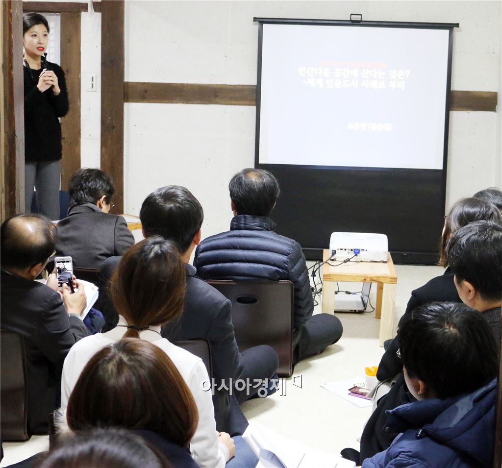 [아시아경제 노해섭 기자]광주시 광산구(구청장 민형배)가 지역을 인문도시로 만들기 위한 워크숍을 지난 17일 가졌다. 장덕동 근대한옥에서 개최한 워크숍 주제는 ‘자치의 시대, 인문정신으로 여는 도시 디자인의 길을 찾아서!’였다.광산구는 서윤경 서울시립대 연구교수의 ‘도시공동체와 공공공간’, 도승연 광운대 교수의 ‘세계적 인문도시 사례’강의순으로 워크숍을 진행했다. 강의 후에는 박구용 전남대 교수가 주재하는 토론회가 이어졌다. 이날 워크숍에는 민형배 광산구청장을 비롯해 인문도시 광산 사업 관련 부서 공직자 등 30여 명이 함께했다. 노해섭 기자 nogary@<ⓒ세계를 보는 창 경제를 보는 눈, 아시아경제(www.asiae.co.kr) 무단전재 배포금지>
