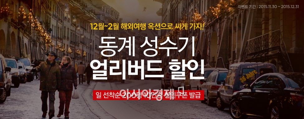 [아시아경제 김현정 기자] 온라인마켓 옥션이 동계 성수기 얼리버드 할인 프로모션을 마련했다고 21일 밝혔다. 오는 31일까지 진행되는 이번 프로모션에서 12월부터 2월까지의 동계 기간 해외여행 상품을 할인 된 가격으로 만나볼 수 있다. 이와 함께 매일 200명에게 10만원 할인쿠폰을 발급하는 이벤트도 진행한다. 옥션은 매일 자정, 200명에게 패키지·에어텔 전용 10만원 할인 쿠폰(150만원 이상 구매 시)을 제공한다. 또한 모바일로 모두투어 상품을 구매하는 고객들에게는 매일 100명에게 10% 할인 쿠폰(최대 5만원 할인)을 증정한다. 이 외에도 옥션 회원이면 누구나 결제 금액에 따라 할인금액이 차등 적용된다. 이번 기획전에서는 하와이, 괌, 보라카이, 중국 등 다양한 국가의 여행 상품을 준비했다. '괌 PIC 골드 세미팩 4일, 5일 상품'은 자유여행과 패키지를 혼합한 상품으로, 괌 아일랜드의 유명 관광지를 자유롭게 관광하고 종합 휴양 리조트 숙박권을 통해 편안한 휴식을 즐길 수 있다. 옥션은 이번 기획전에서 30만원 할인 된 119만9000원(성인 1인 기준)에 선보인다. '사이판 월드리조트 세미팩 4일, 5일 상품'은 칵테일 쇼, 아로마 마사지 등 다양한 선택 관광을 포함해 84만9000원(성인 1인 기준)이다. 12세기 앙코르왕조의 전성기를 체험할 수 있는 '캄보디아 앙코르왓 준특급 패키지 5일 상품'은 15만원 할인 된 가격인 37만9000원에 판매된다. '하와이 호놀룰루 6일 자유여행상품'은 기존 가격보다 10만원 할인 된 140만4000원에 만나볼 수 있으며, 특급 쉐라톤호텔 숙박을 포함한 세미팩 상품도 10만원 할인 된 가격인 214만원에 판매한다. 피피섬 관광과 야시장 투어 등을 즐길 수 있는 '푸켓 특급 라마다 5일 상품'은 15만원 할인 된 57만9000원에 구매 가능하다. 옥션은 '12월의 여행클럽' 코너를 통해 회원 등급별 스페셜 쿠폰을 지급해 최대 5000원의 중복 할인 혜택을 제공한다. 결제금액별, 카드사별로 항공권과 국내외 숙박 할인쿠폰을 증정하는 이벤트도 마련했다.김현정 기자 alphag@asiae.co.kr<ⓒ세계를 보는 창 경제를 보는 눈, 아시아경제(www.asiae.co.kr) 무단전재 배포금지>